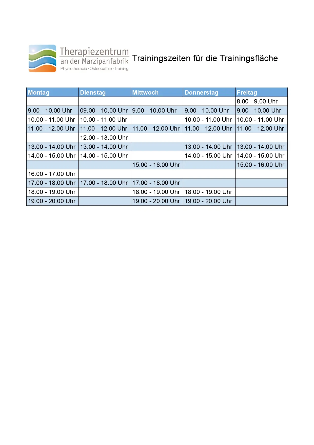 Zu folgenden Trainingszeiten steht Ihnen unsere Trainingsfläche für Physio-Training zur Verfügung.